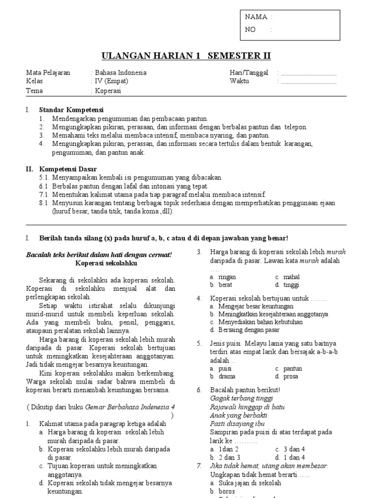 Soal Uts Bahasa Indonesia Kelas 4 Sd Semester 2 Pdf