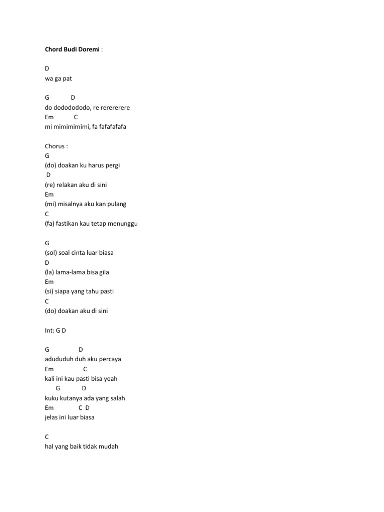 Budi Doremi - Tolong. A satu kali ku bertemu Fm dualam sudah rasaku Bm E tiga kata yang ku tahu aku cinta padamu A empat malam ku menunggu Fm jawaban cinta darimu Bm lima tanda yang kau beri E enampaknya kau cinta padaku E enam. Lirik Lagu dan Kunci Gitar Kord Chord Budi DoReMi - 123456 G Em Am D G ada sebuah cerita Em tentang aku dan dia Am jumpa pertama ku dengannya D di.