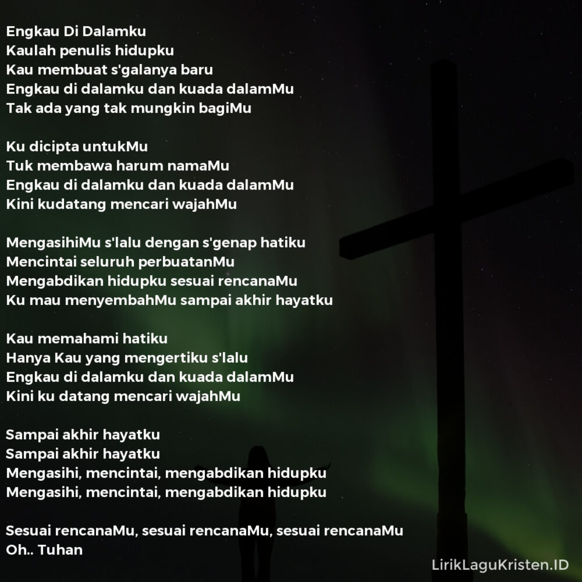 Engkau di dalamku dan ku ada dalam-mu tak ada yang tak mungkin bagi-mu. Tuk membawa harum namaMu Engkau didalamku dan kuada dalamMu. Author yovio a 20.