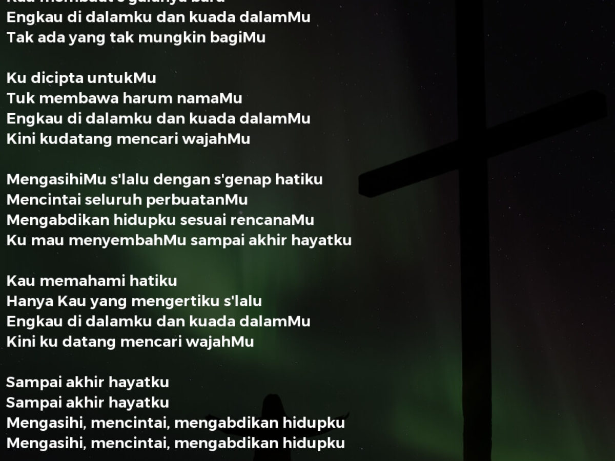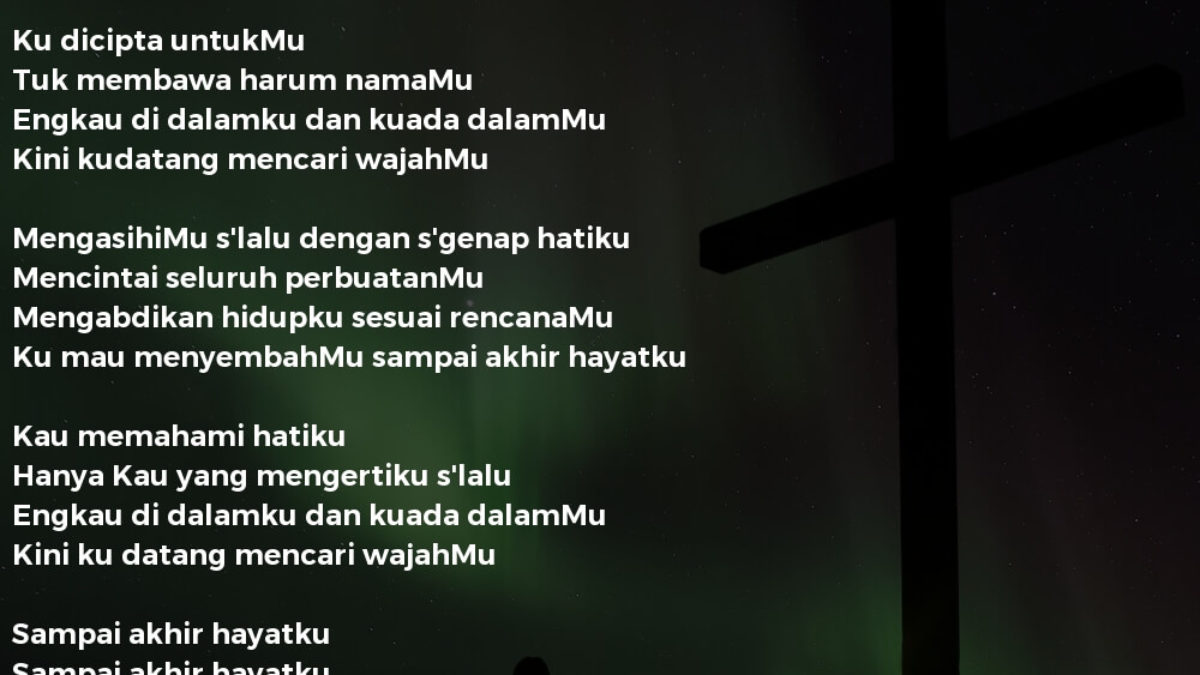 Blog ini tidak menyediakan link download gratis MP3 dari lagu rohani diatasSilahkan membeli album fisiknya atau mendownloadnya secara legal. Mengasihi-mu slalu dengan segnap hatiku mencintai seluruh perbuatan-mu mengabdikan hidupku sesuai rencana-mu ku mau menyembah-mu sampai akhir hayatku. Ku dicipta untukMu Tuk membawa harum namaMu Engkau di dalamku dan ku ada dalamMu Kini ku datang mencari wajahMu 3.